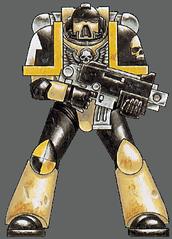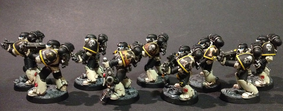 I gave different elements of the shoulder pads – of the skulls – different meanings. Adding fire denoted special/heavy weapons specialists. The size of the skull denoted the length of their service to the chapter. Veteran Sgts and 1st Company replaced the yellow banding with metallic Gold. Some would have a bone and/or gold ‘M’ (either on its own or incorporated with the skull) to signify taking part in a specific campaign (as yet undecided by myself). And due to all of that, the below and above pictures should give you an idea of the variety that’s possible and how I’m doing this.