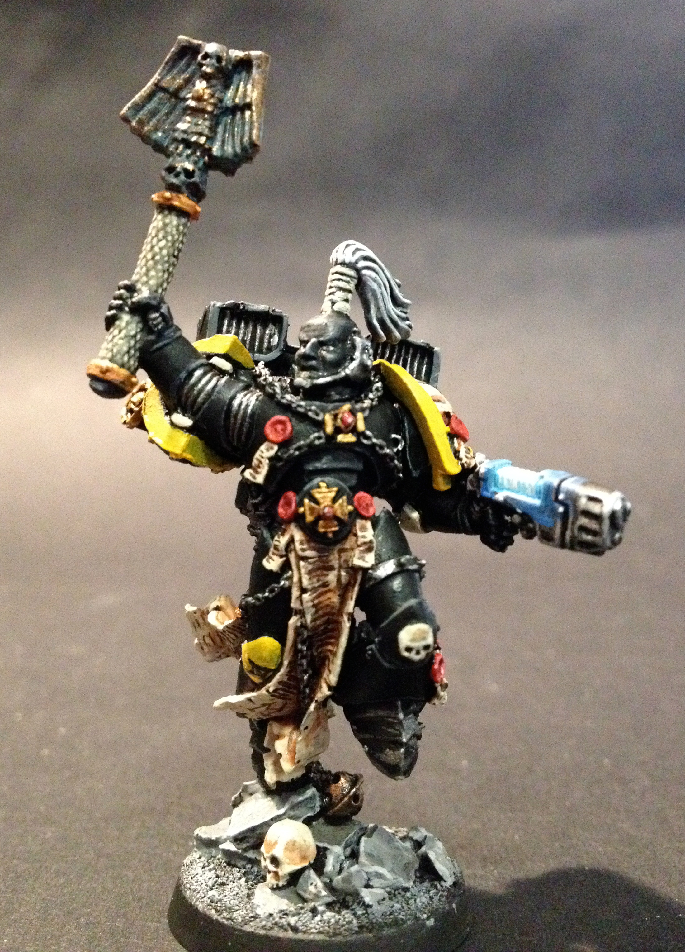 My Mortifactors Chaplain is finished and, if I’m being completely honest about it, I’m not entirely happy with him. There are parts of it, that I really like. The source object lighting on the plasma pistol is a real win for me – not done it to that scale before and I’m happy with how it turned out. I thought I did the parchment quite well and the weathered bronze on the Crozius looks really good to my eye. I’m also pretty happy with the jet-black skin which may be part of the fluff, but could have gone really wrong and ended up looking a bit comedy because any time you go out of the normal range of human skin-colours, it’s very easy for it to go wrong. But it turned out alright and I’m fine with the idea of doing it more in the future. Oh, and I like the job I did on the base too.