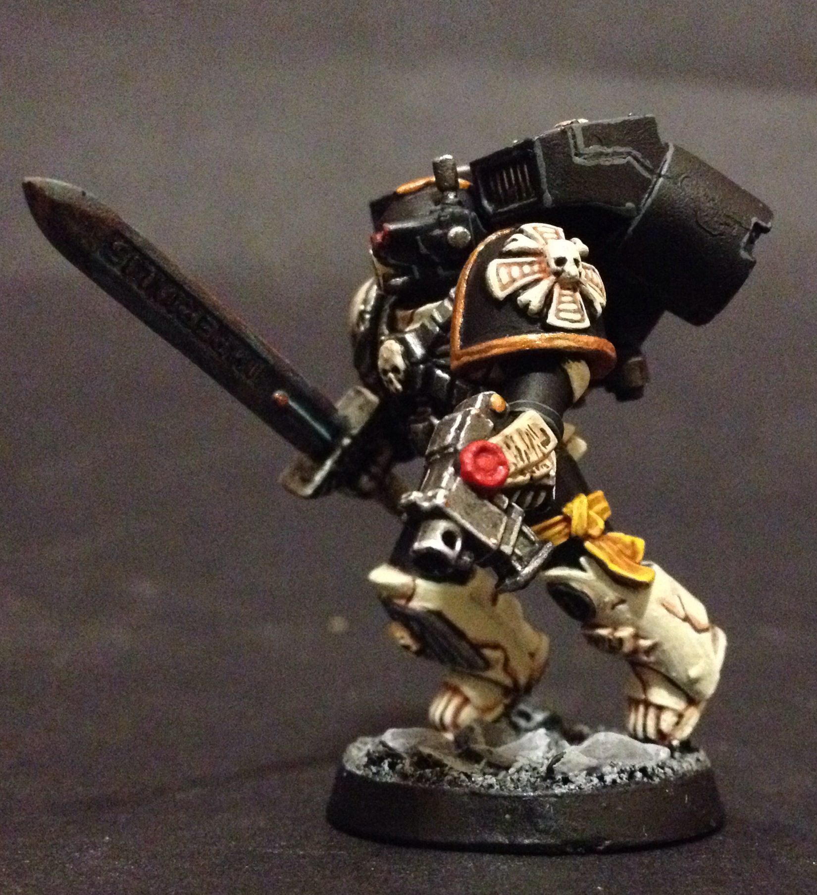 I’m over half way! The third of my five Vanguard Veterans is done and on the shelf. This guy is wielding the longer of the power swords that comes in the kit and one of the venerated bolt pistols. You’ll also see another great couple of examples of the shoulder pads you get in this box. The head on the other hand comes from the new tactical squad box and, if I’m being honest, I didn’t quite nail the red lenses on this one. I may even revisit them later and attempt a minor fix.