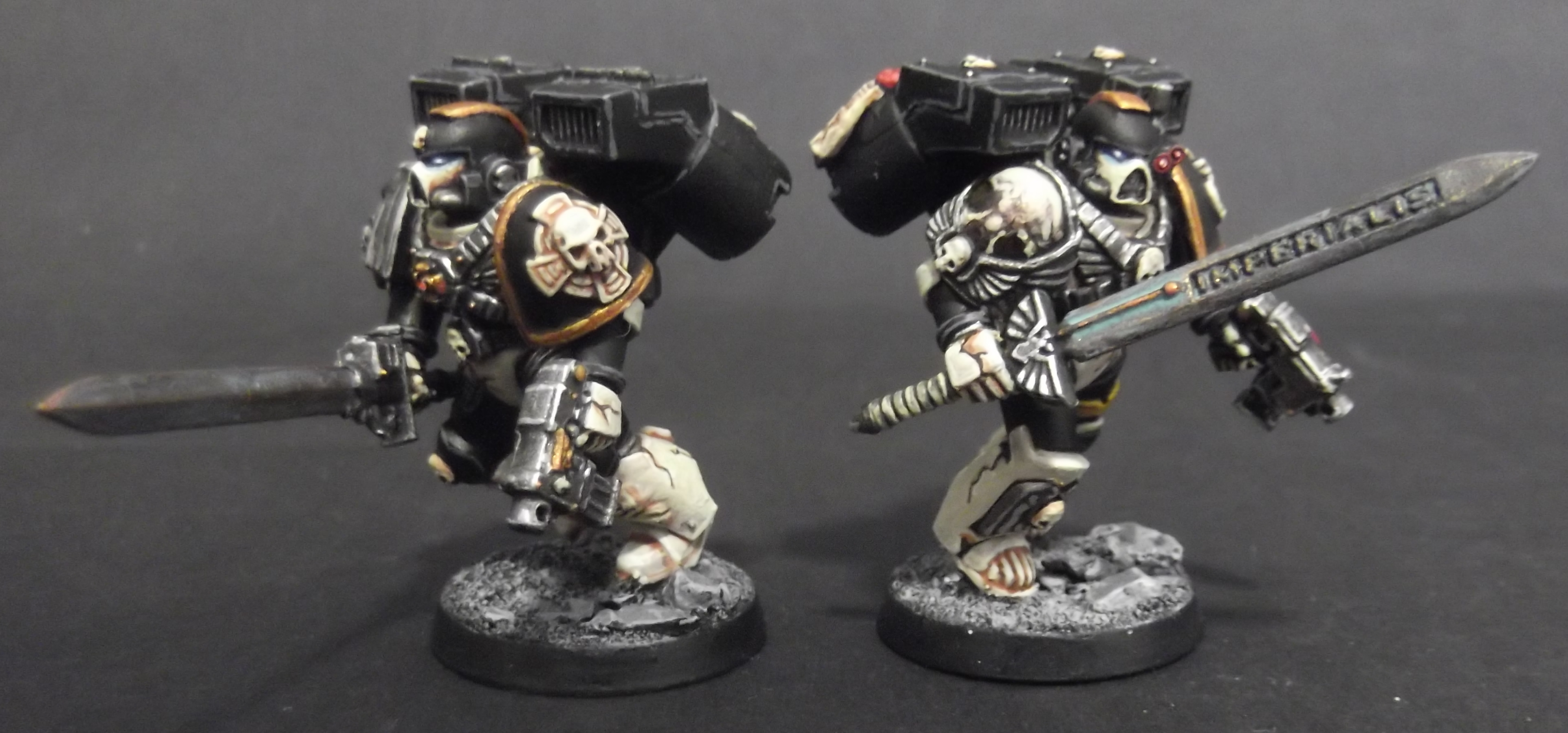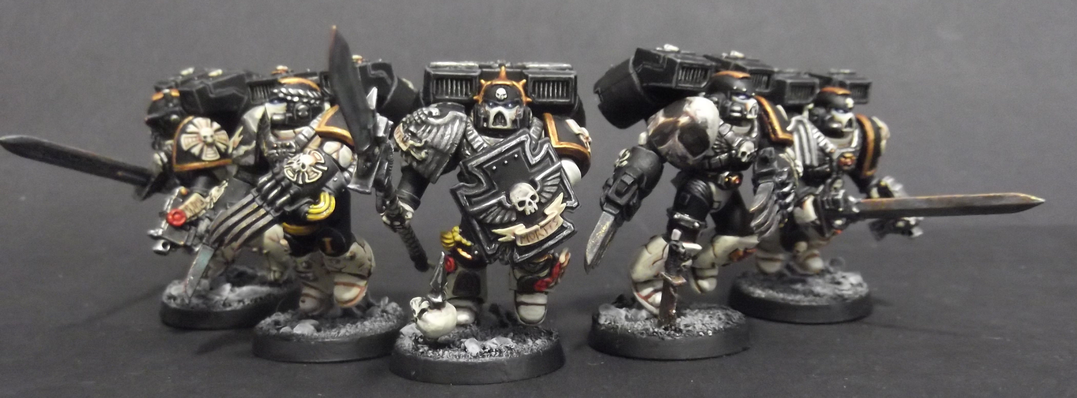 Although the most daunting part of the painting process (along with the long slog involved in getting the bone painted up) was the freehand on some of the shoulders. It’s not a quick process and it’s very easy to get wrong, so I’m proud that I didn’t screw up. I also think I nailed the Crux Terminatus on every single one of them and that’s a great score. Regarding that bone, that didn’t look at its delicate best on these. I was a bit too cocky with it this time and maybe didn’t give it the care it deserves so some of these cracks look a little ‘unnatural’. Happily the rest of the models’ looks make up for that. Oh, and I’m not too chuffed with my edging on the jump packs, so I might have a little clean up of that later on.