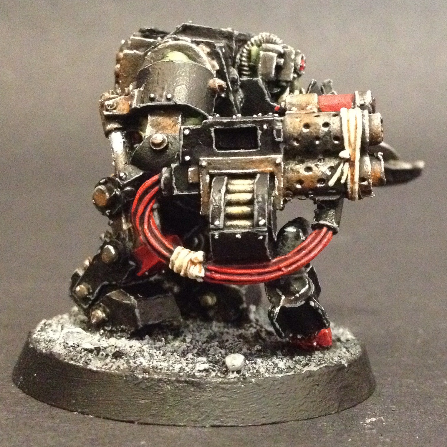 Other than all of that, it’s as you were really. A rusty klaw that I’m very happy with, a couple of nice glyphs and a lighter skin shade for this ork too. Actually, I’ve been ecstatic with the skins I’ve managed to do and it’s so fun to paint that there have actually been a couple of times when I’ve almost thought ‘yeah, I could do an Ork army…’ and then the Emperor’s ghost bitchslaps me and I remember that not every boy is as fun to paint as these guys. Still, there’s a relatively simple formula that I could share on here at some point – it’s pretty fun and I at least like the results.