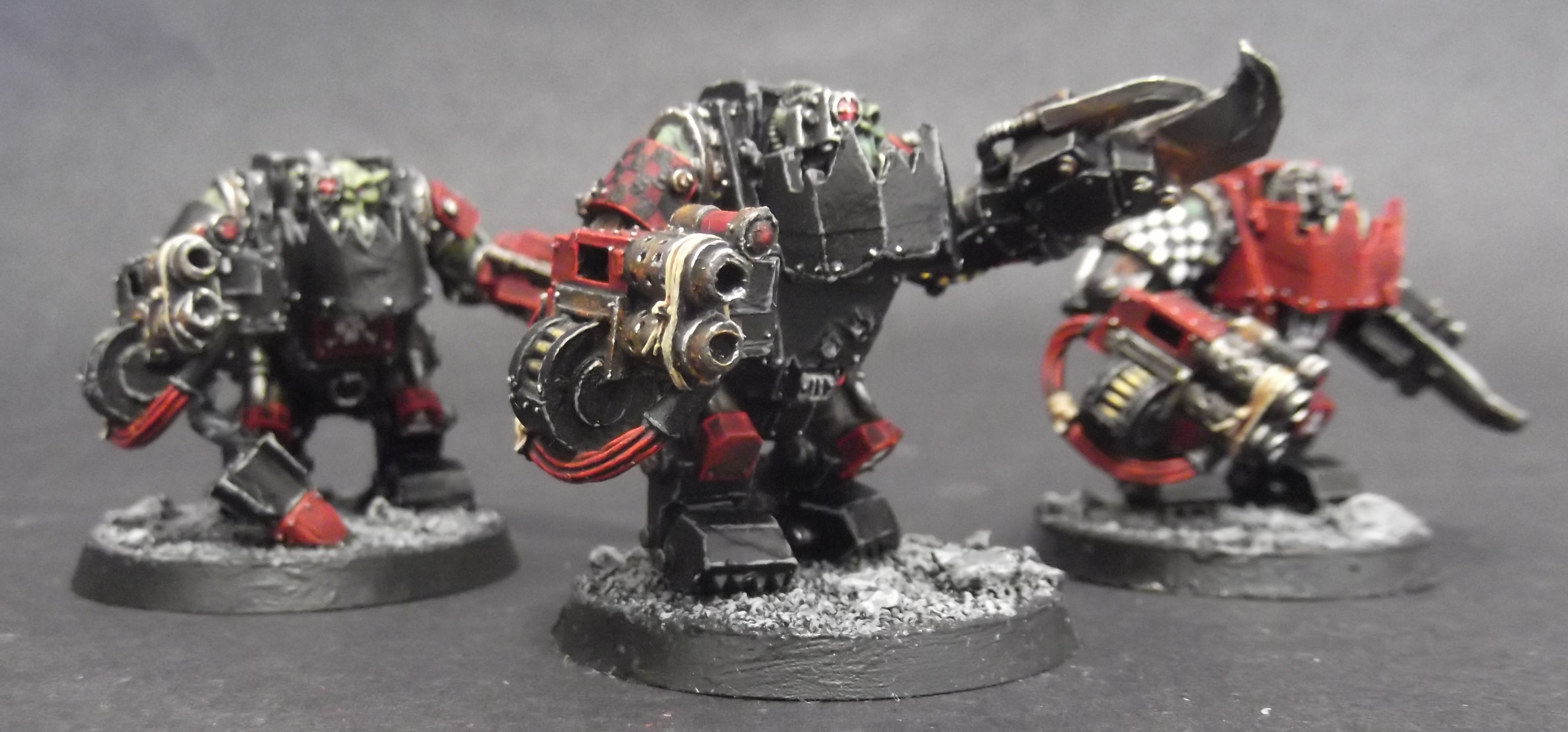 The things I’ve really enjoyed about this mini project include learning how to paint Ork skin again, the sheer amount of rust I’ve been able to add and the checks. Those checkered patterns were loads of fun to do and I’m happy with the results – especially the black/red check.