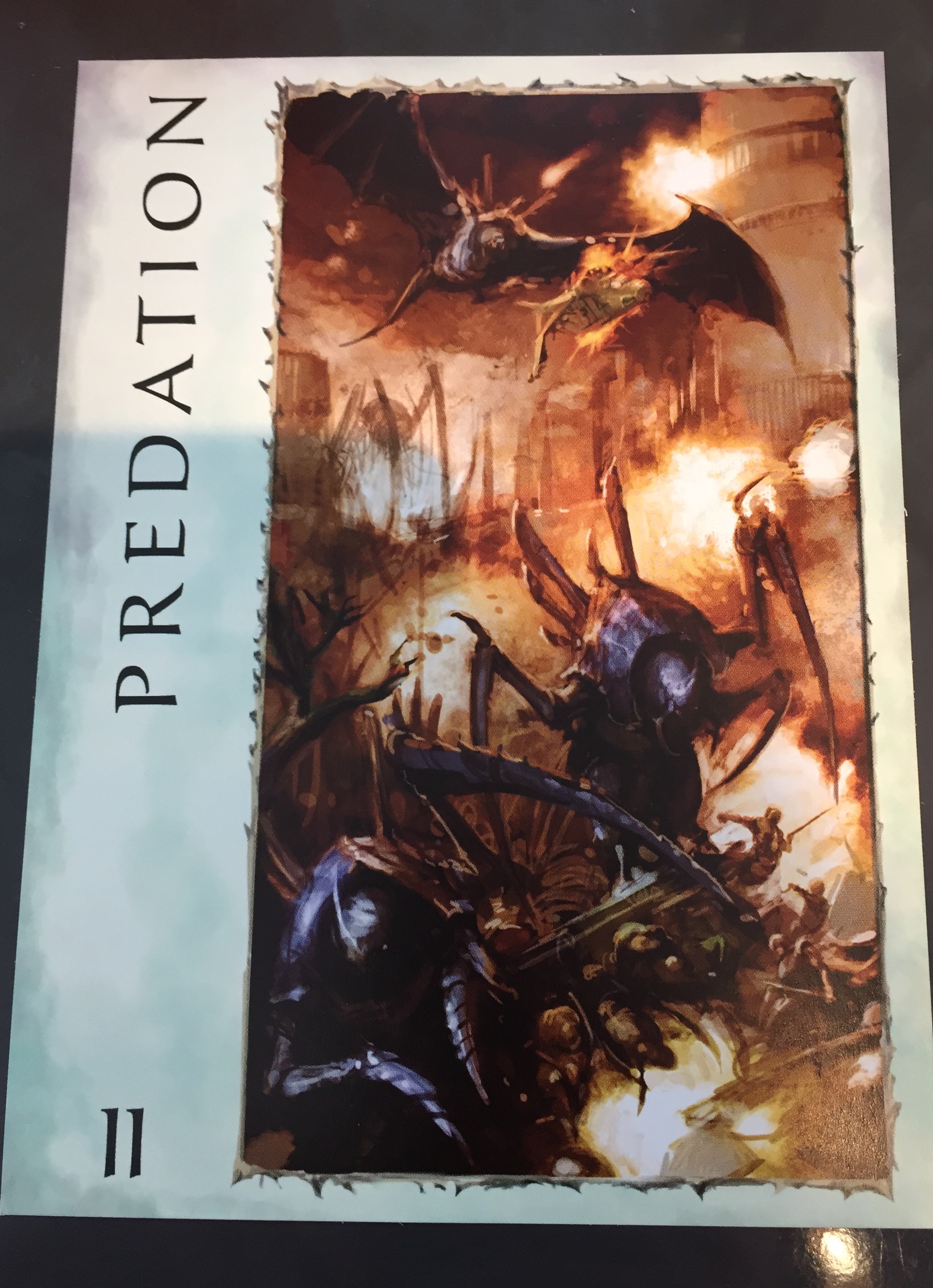 This postcard sized piece of promo material appeared in my package and highlights the four stages of a Tyranid attack on a world. With the other side highlighting the second stage…