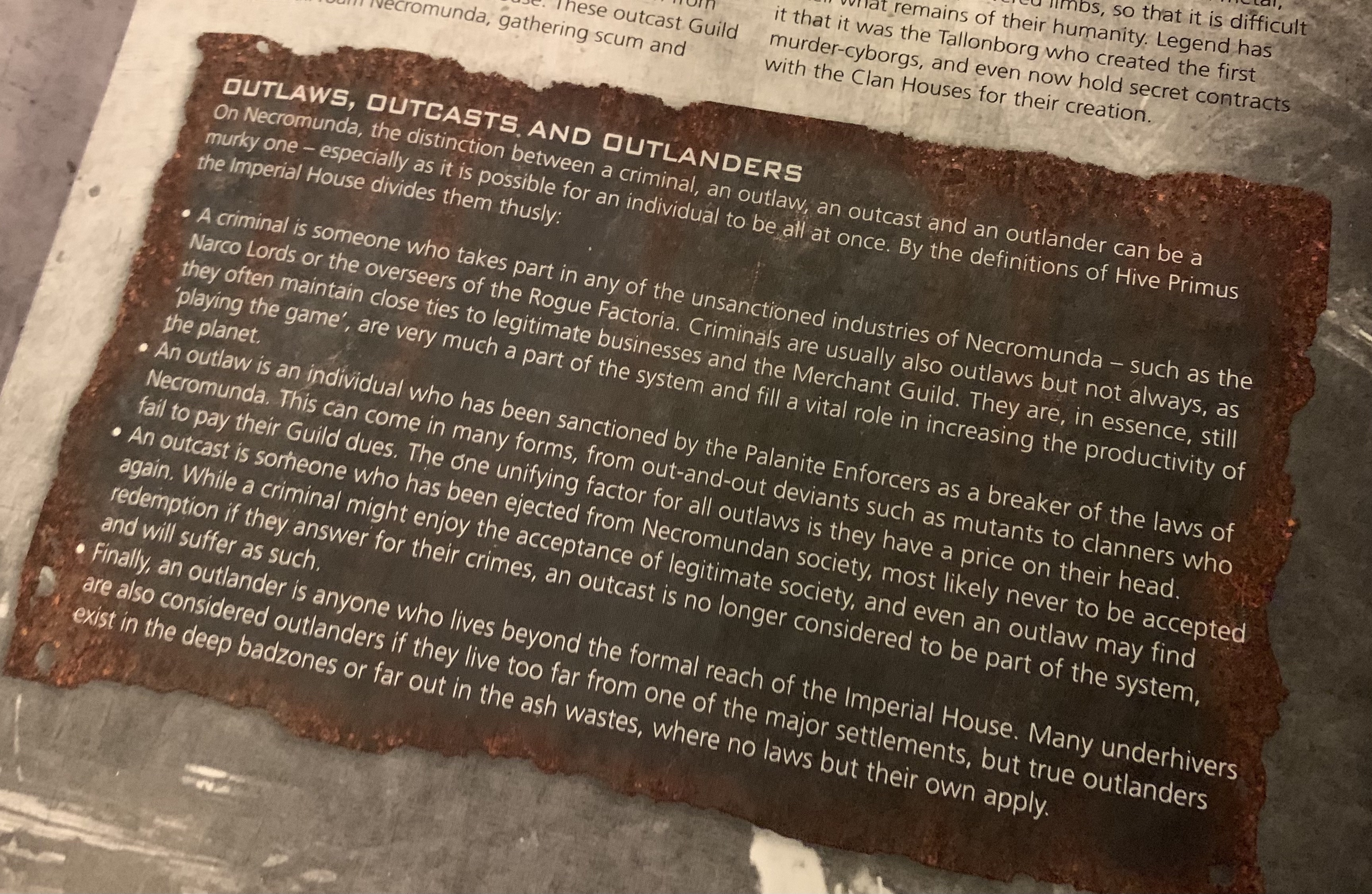 The books itself is amazing. Absolutely jam-packed with lore that helps to flesh out the setting beyond the famed houses. I could point out hundreds of examples of this being done here in this book, but I really like these pages that define the differences between outcasts, outlanders and the rest: