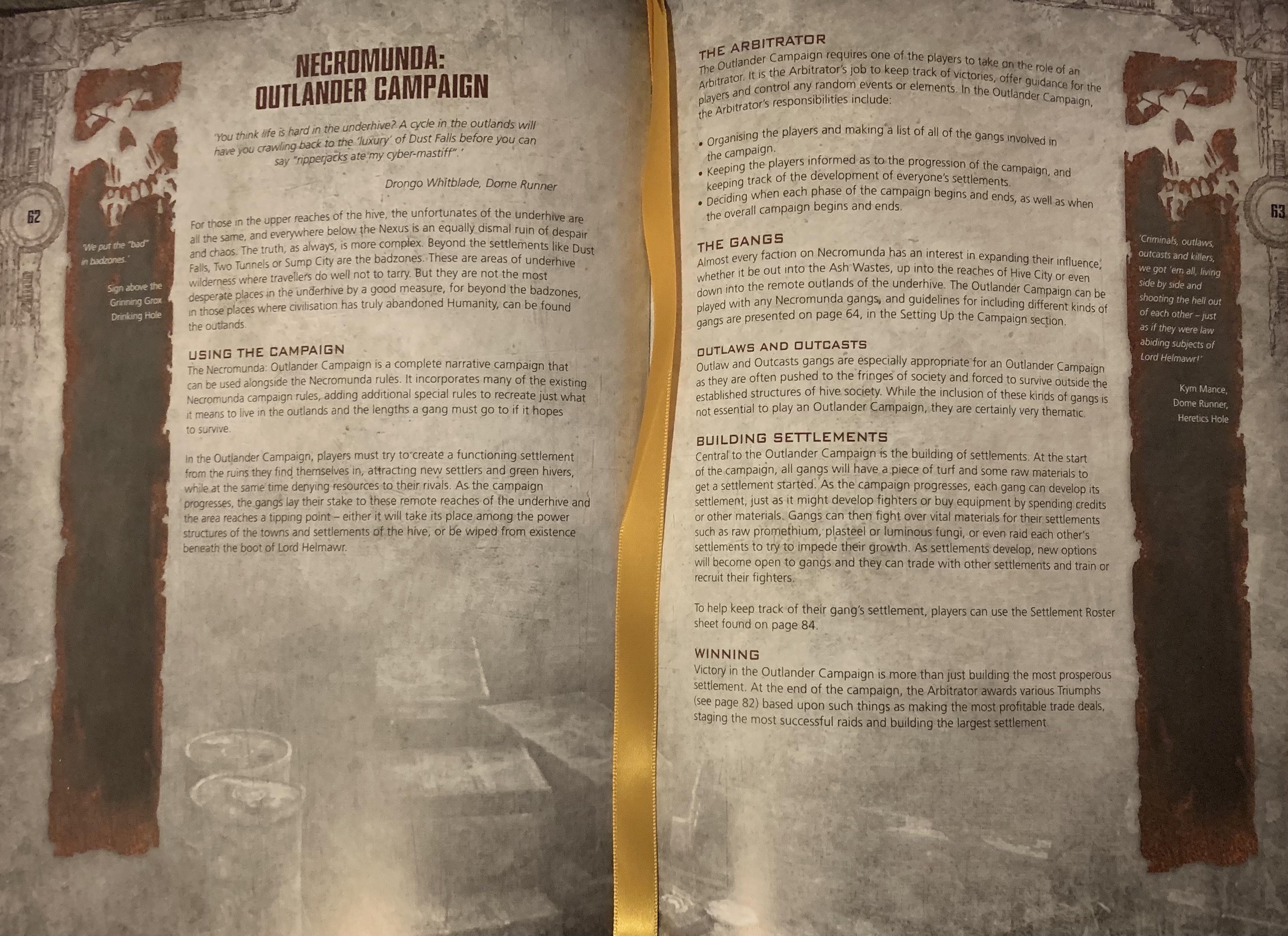 That’s such a great way to further theme your gang, and as a hoarder of bits myself, it’s a great way to use up some weapons, heads, and other paraphernalia from the Bits Crate (upgraded from a box – I got a lot of bits, man). And what’s more, the get access to hangers on that you can add to your gang, adding yet more flavour. So if you want a criminal gang affiliated with House Orlock that hangs around with an underhive trader and a slopper, you got it! Or would you prefer some deviant outlanders that keep an eye on things in the Underhive for House Ty? You’ve got some great options in these pages.