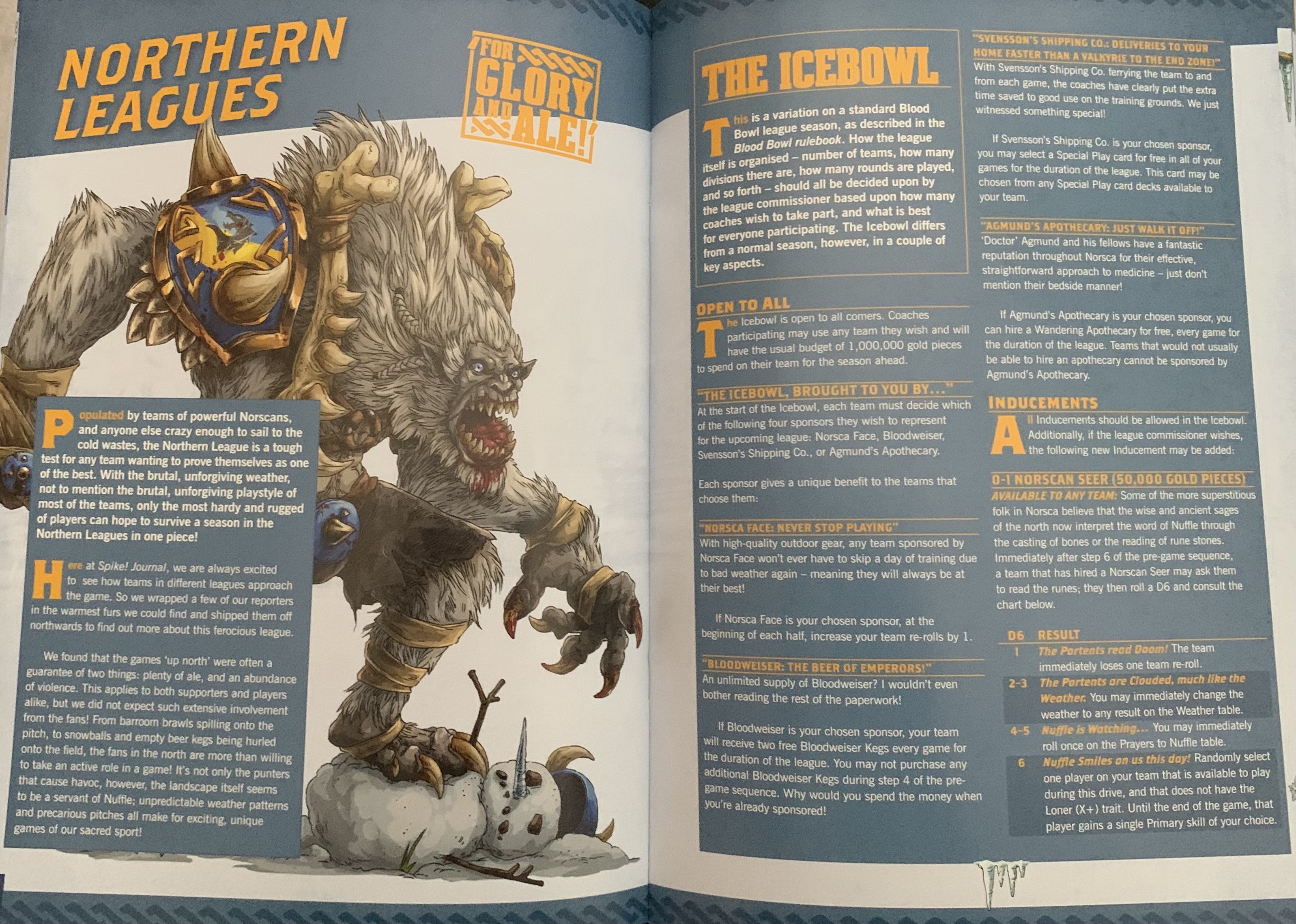 Sticking with the pricy-n-spicy superstar sports-folk that you can hire into your game (or take to one of the aforementioned All-Star games), there are some wonderful Star Player profiles in here, some of which, if you buy Spike! regularly, you’ll already know about, but I think there are a couple of new ones here too (I think – I don’t get Spike! every time it comes out). I really like how they do this, in that there’s a nice big illustration, the rules, and some back ground spread across two sides of A4. It’s concise, yet flavourful and lavish at the same time. And seeing the rules for Grashnak Blackhoof really took me back to my early days in Blood Bowl – that minotaur used to do a lot of heavy lifting in my teams.