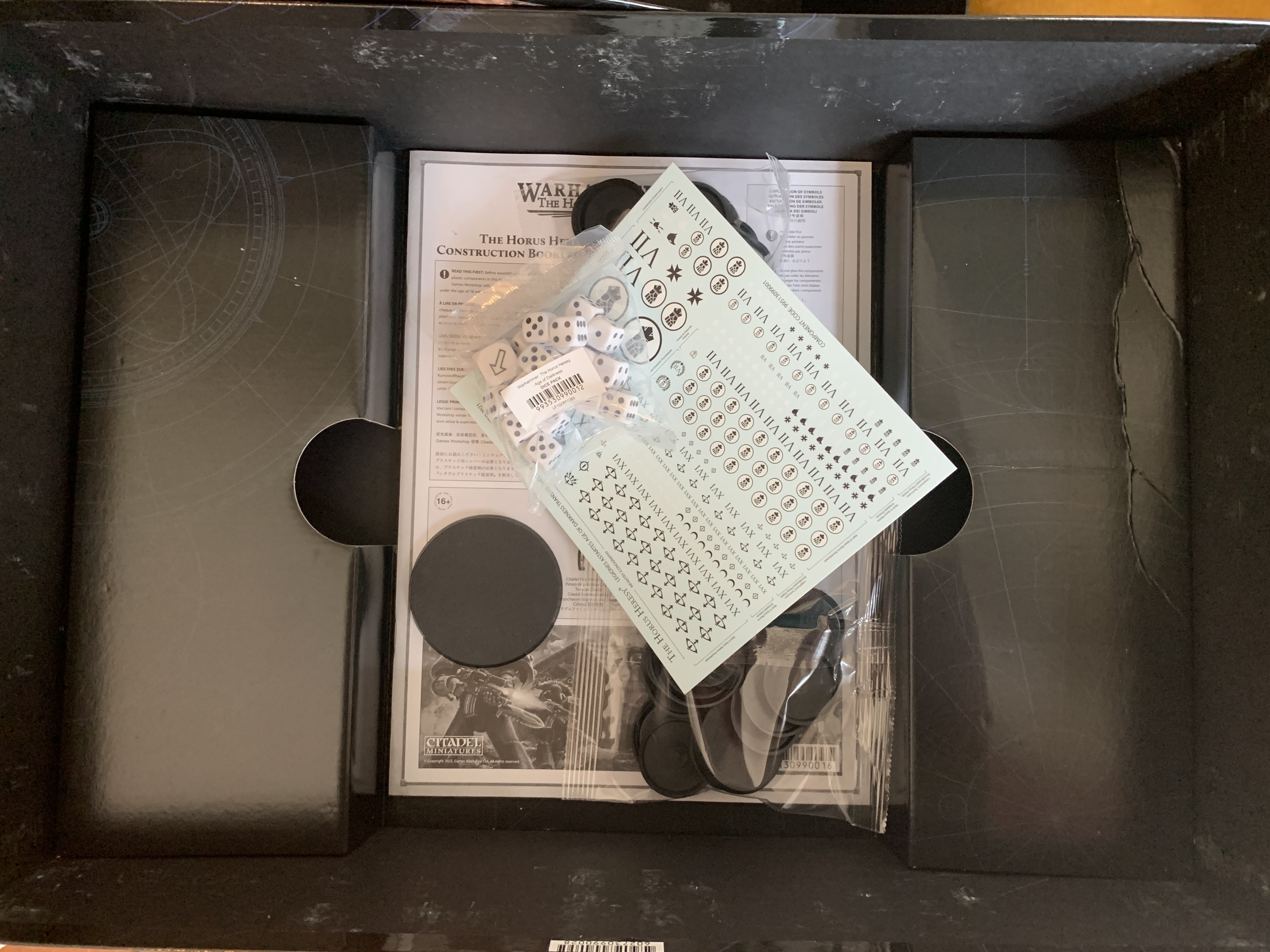 Tucked away beneath the cardboard inserts that hold the book in place, we have a bunch of bases, some transfers, dice and construction guides – all the useful stuff that rarely gets any press.