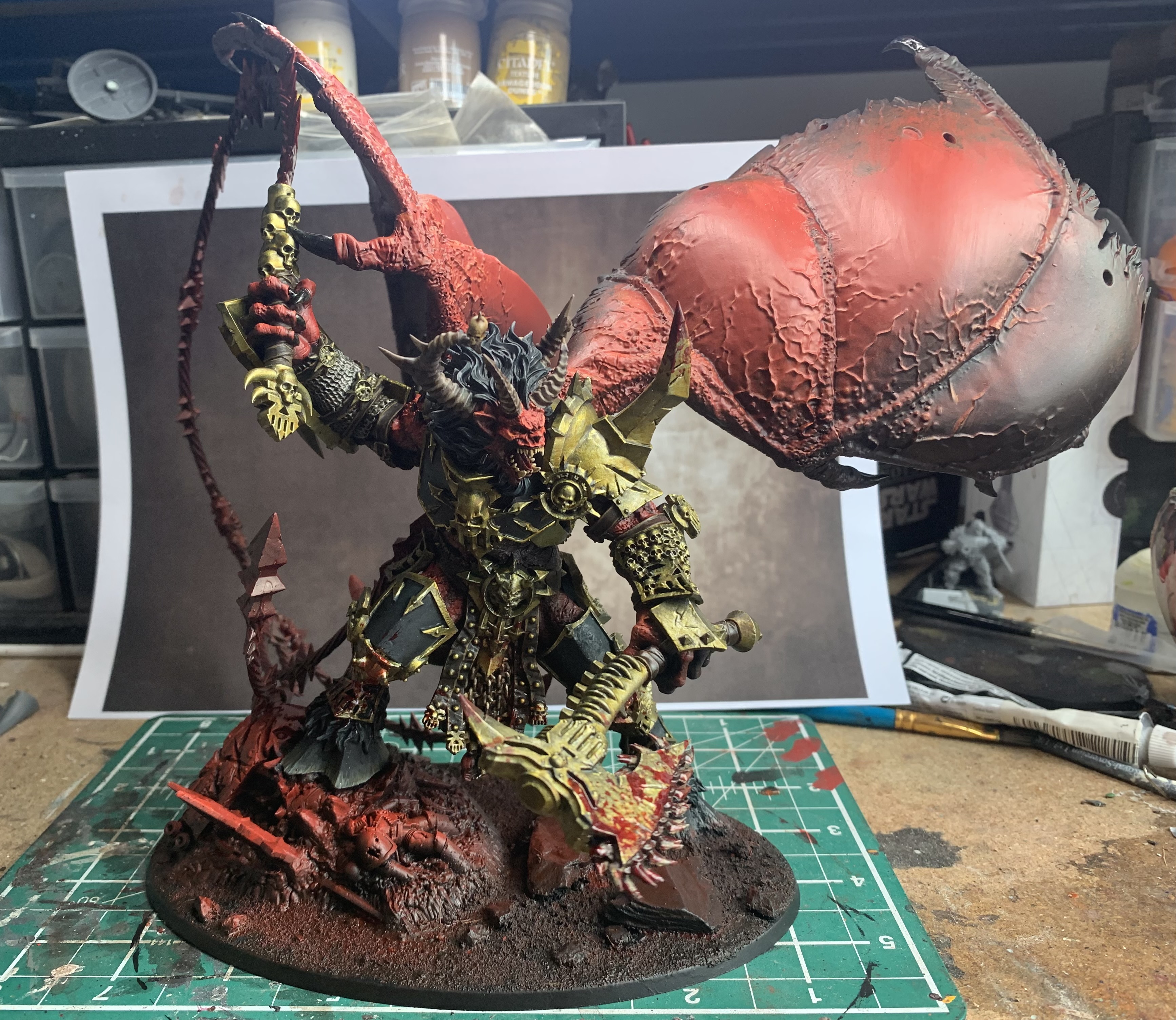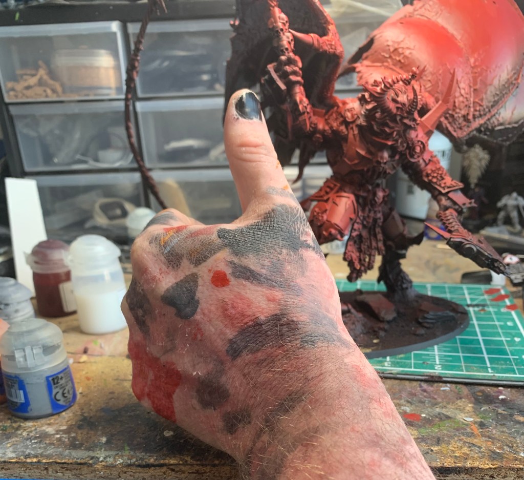 There was a can of Chaos Black, and a can of Mephiston Red and they gave me my starting point when it came to painting – here’s the big fella still drying after he got a coating. Black all over, red just from the top down – that’ll help me with the shadows on his skin at least!