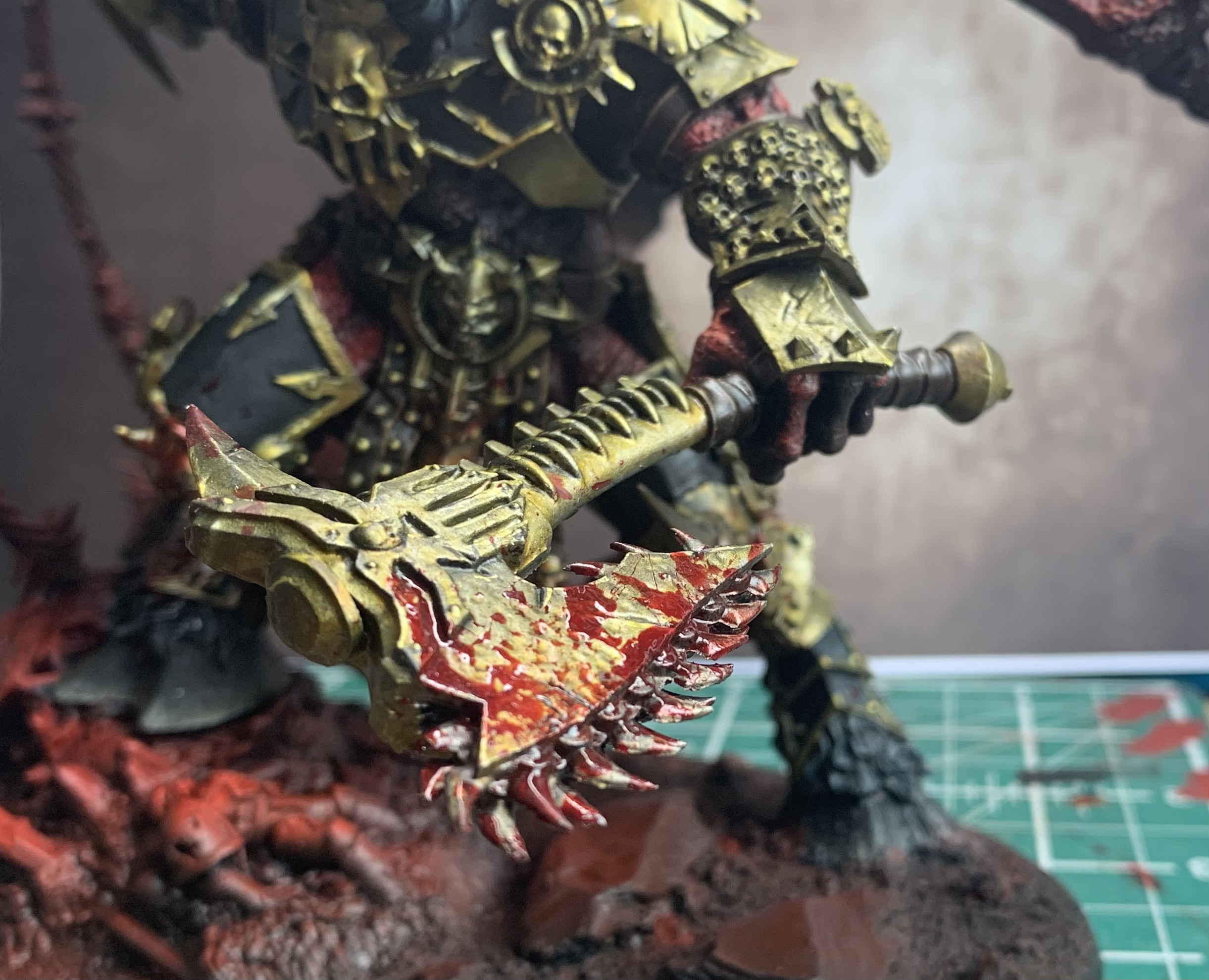 If I had to pick out some highlights, it would be the face and the axe. Both are amazing and for very different reasons. The face is emotive, full of character and it really is the best Khornite set of features I have ever seen. Great work by the sculptors there. And the axe I love because it’s enormous and brutal like you wouldn’t believe. It’s crying out for Blood For The Blood God to be dashed all over it and I wasn’t going to miss the opportunity to have fun there.