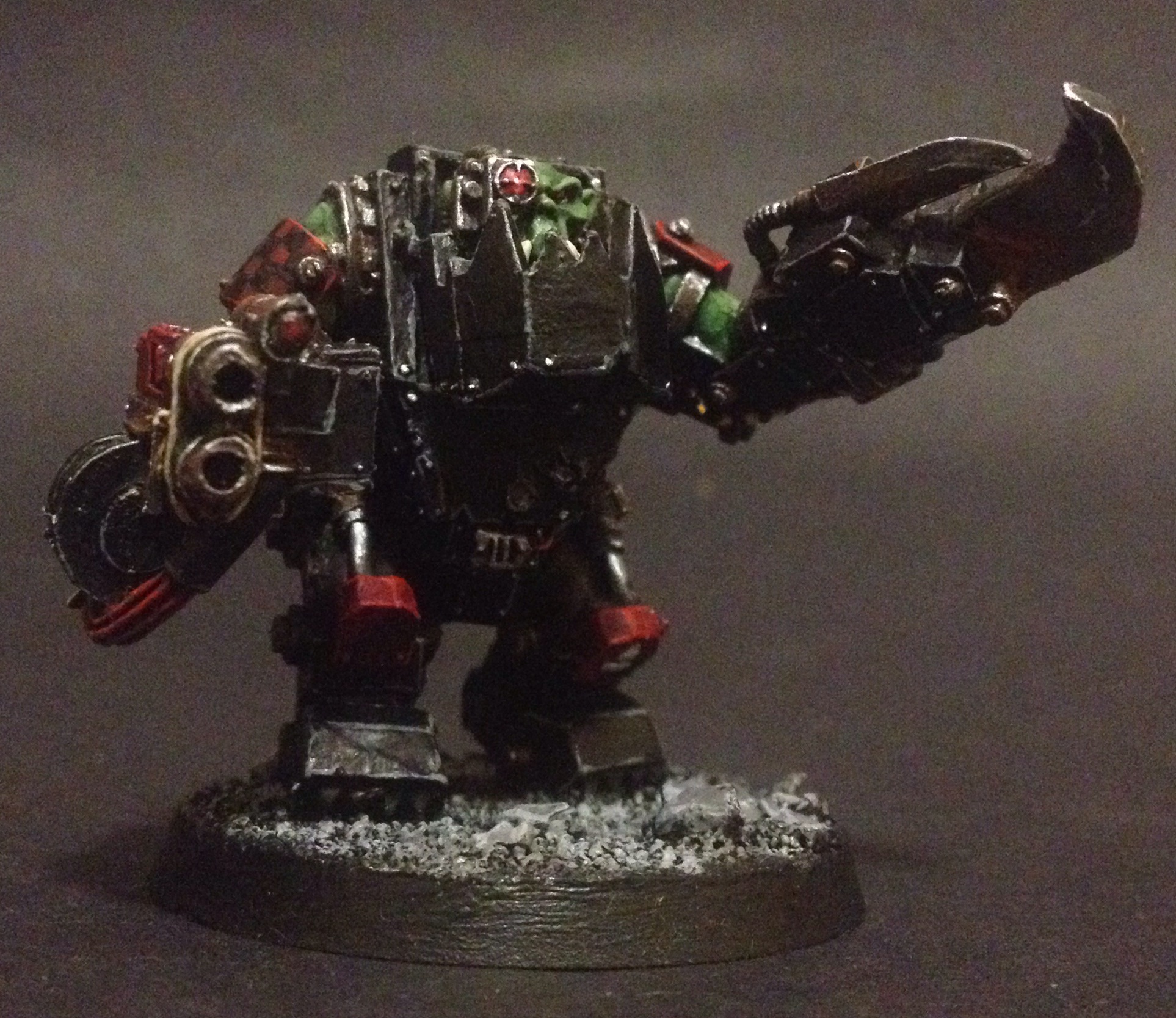 Other than all of that, it’s as you were really. A rusty klaw that I’m very happy with, a couple of nice glyphs and a lighter skin shade for this ork too. Actually, I’ve been ecstatic with the skins I’ve managed to do and it’s so fun to paint that there have actually been a couple of times when I’ve almost thought ‘yeah, I could do an Ork army…’ and then the Emperor’s ghost bitchslaps me and I remember that not every boy is as fun to paint as these guys. Still, there’s a relatively simple formula that I could share on here at some point – it’s pretty fun and I at least like the results.