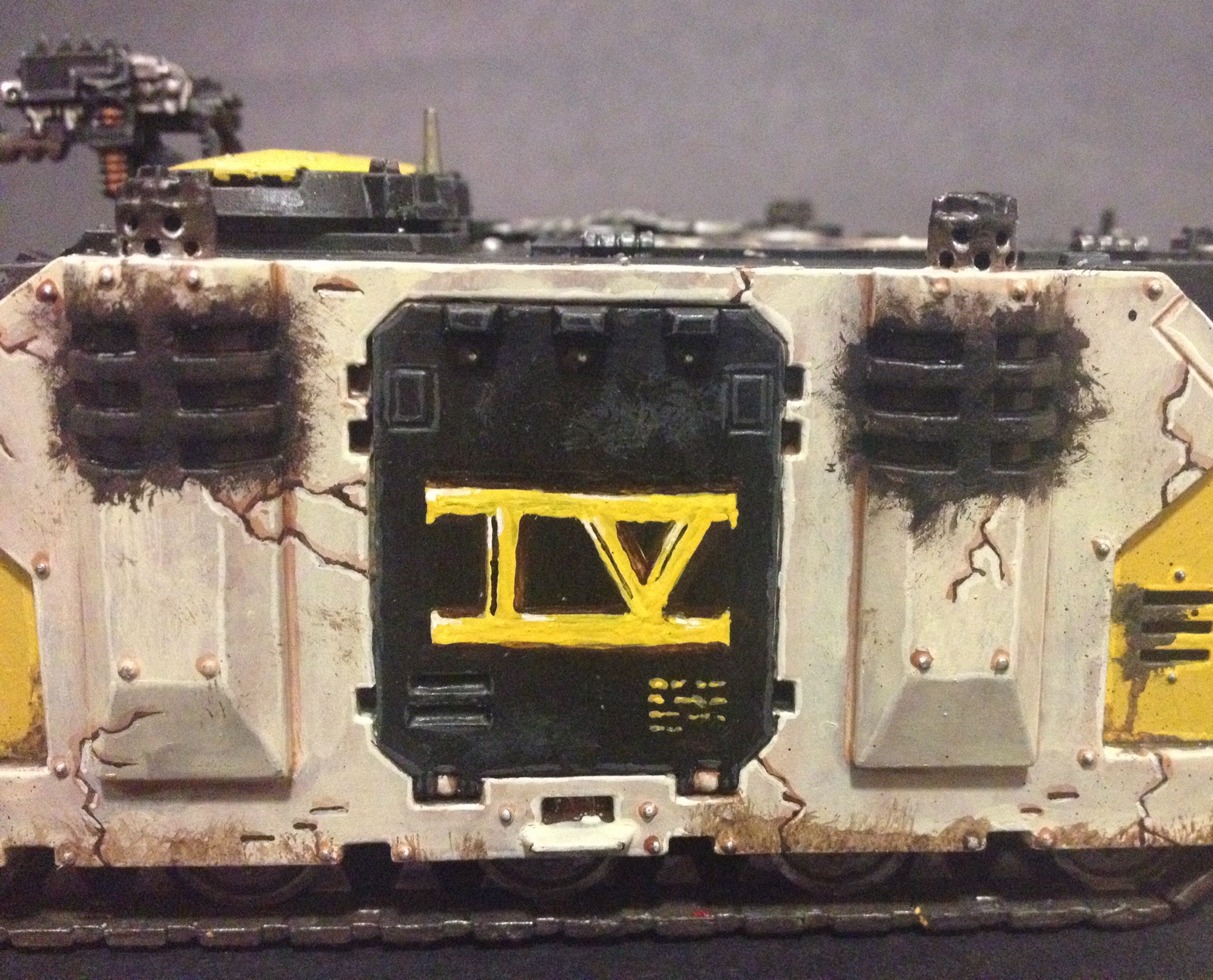 So, yeah, it’s the front of a rhino again. I suppose the weathering is a little different, and the missing paint on the white stripe is also a little different… yeah, it’s a little different. Oh, yes, and there isn’t a flamer on this one. I almost forgot that. This tank sticks to the combi bolters. This was done because I thought it was only right because one ought to have a pure, basic variant. Also, Forge World doesn’t give you enough hatches in the pintle mounted weapons set to allow you to do too many of these – the one minor drawback of a great little upgrade kit.
